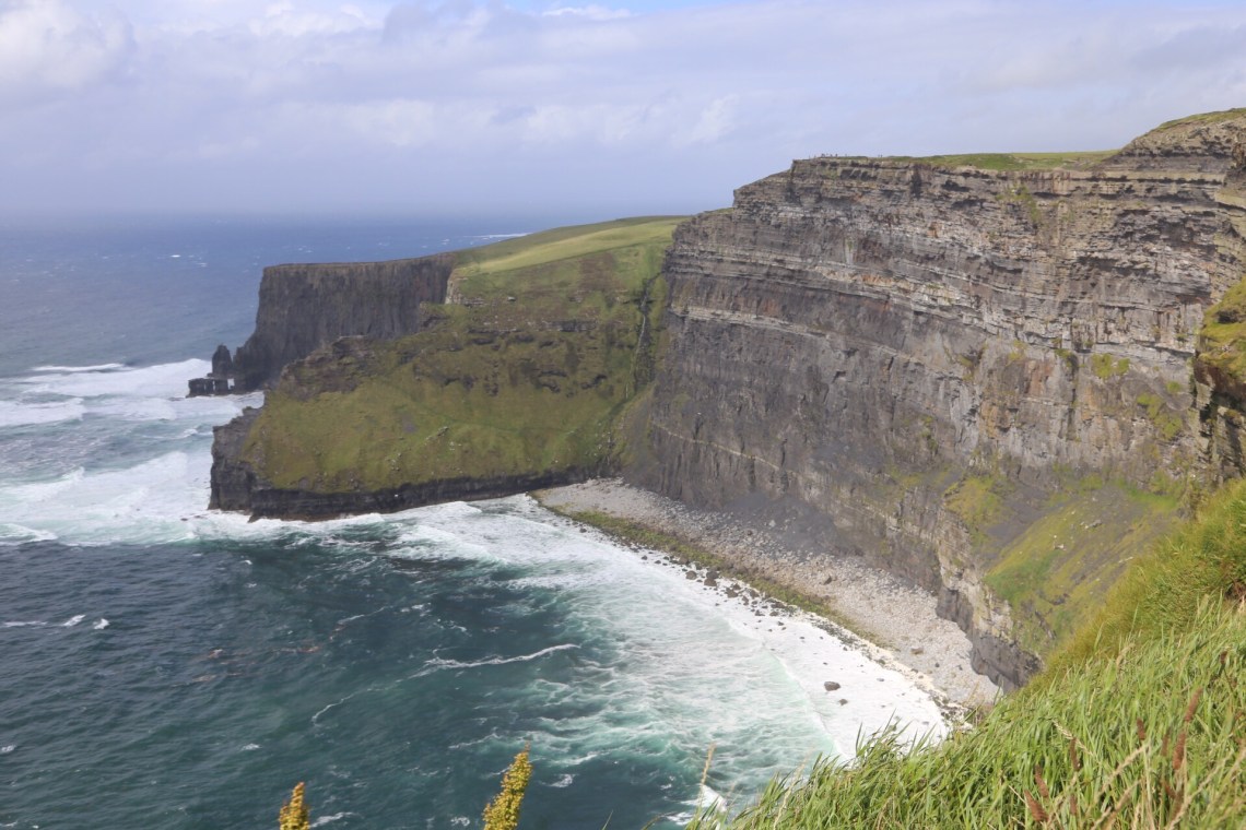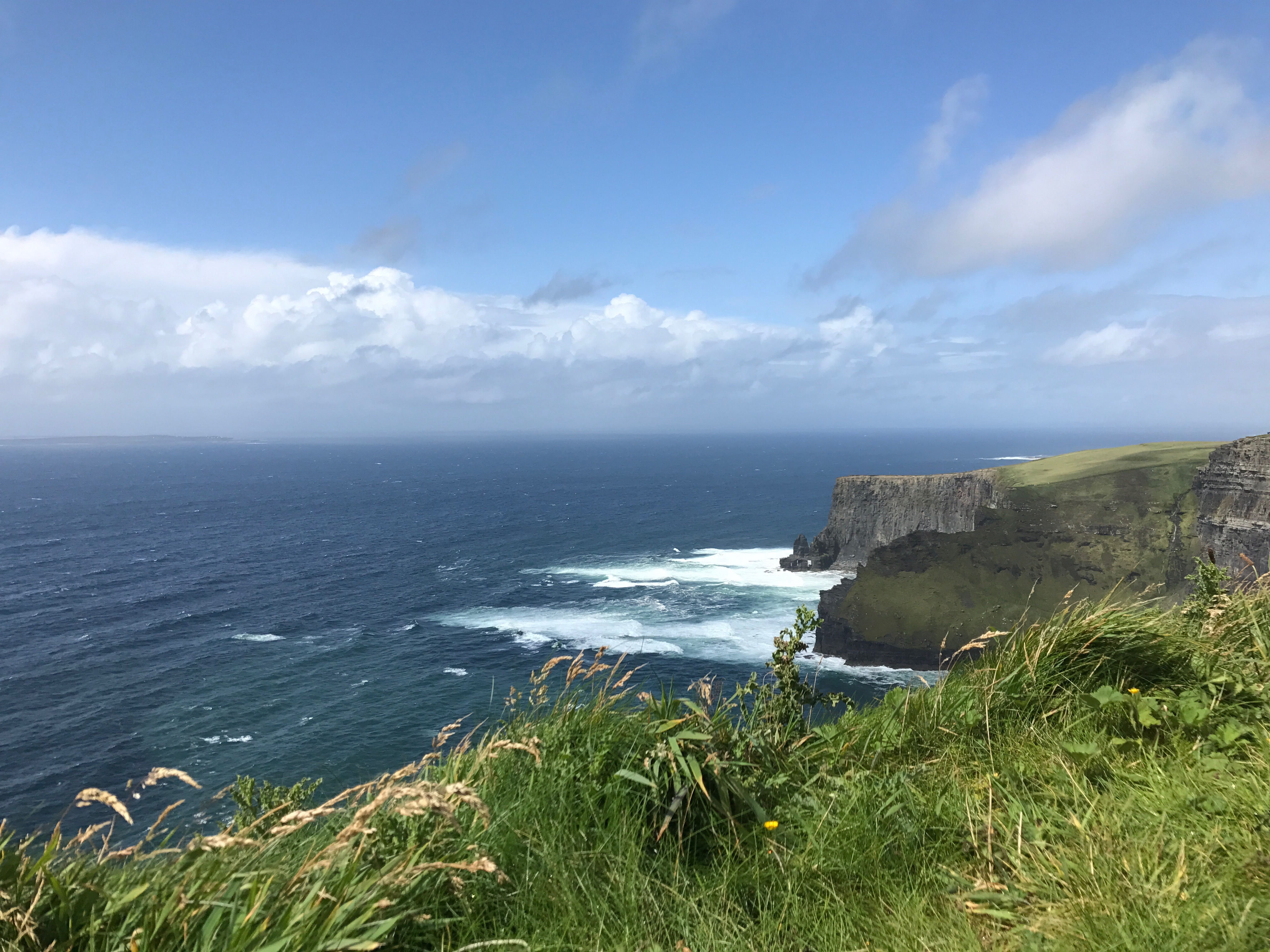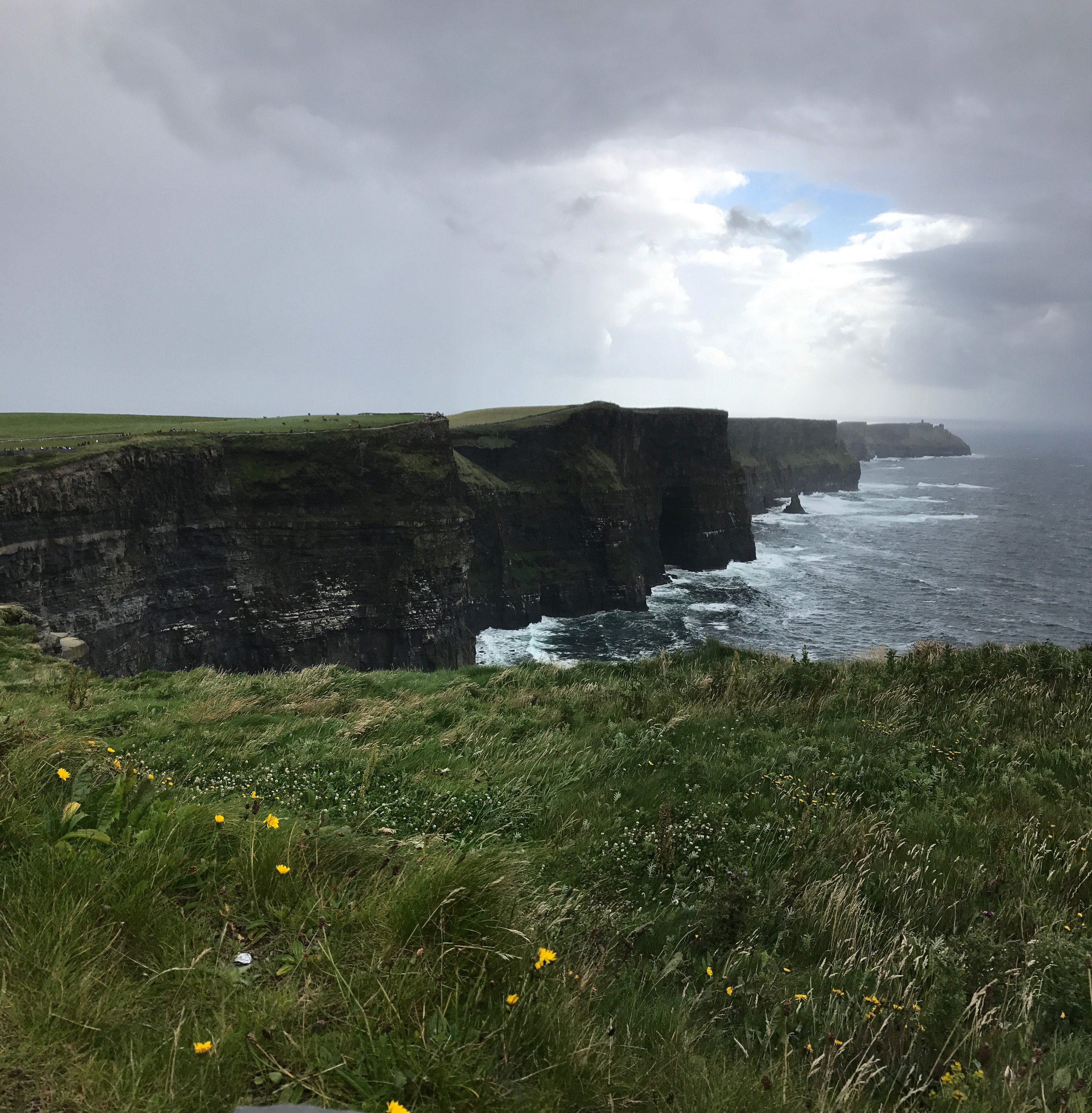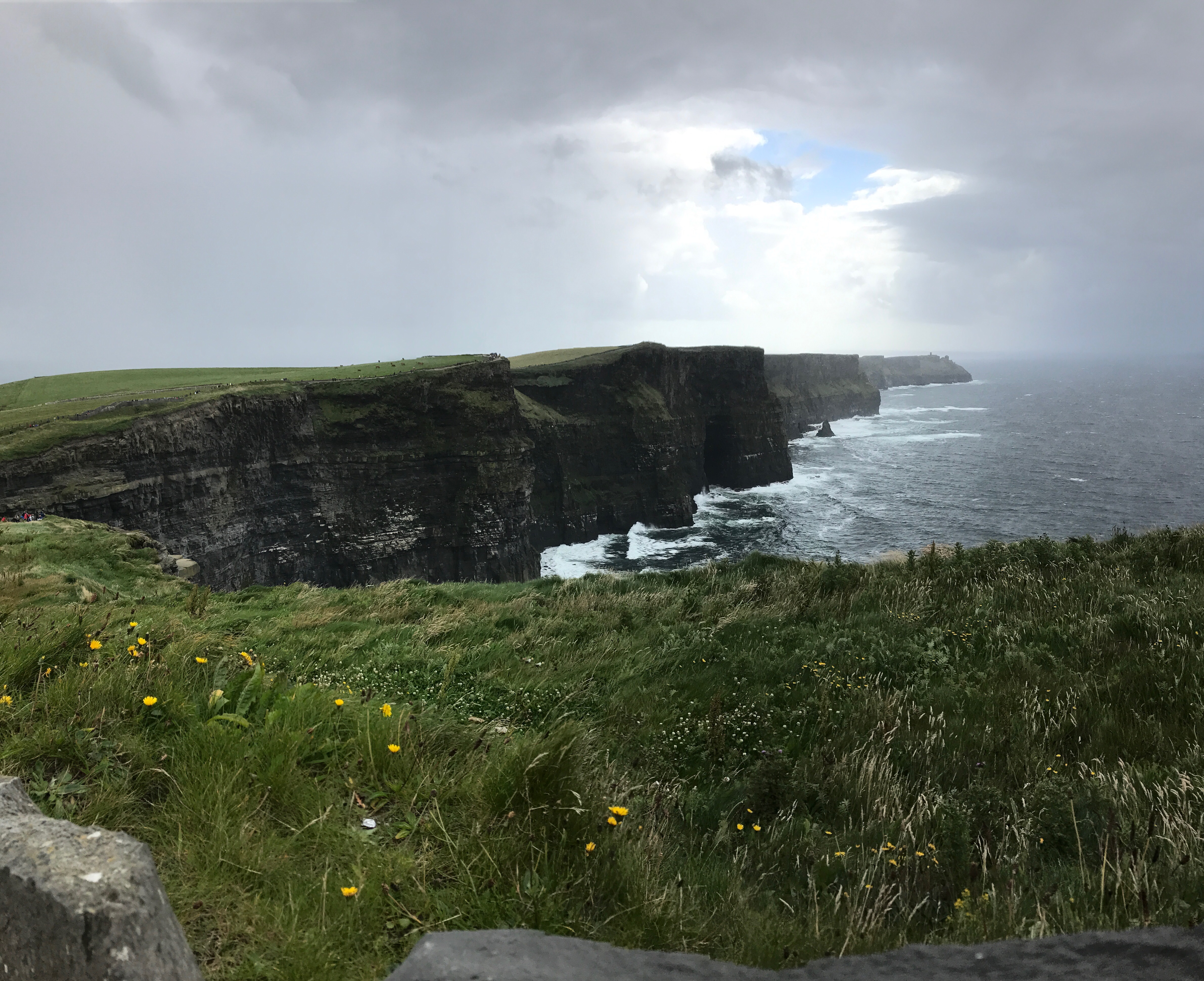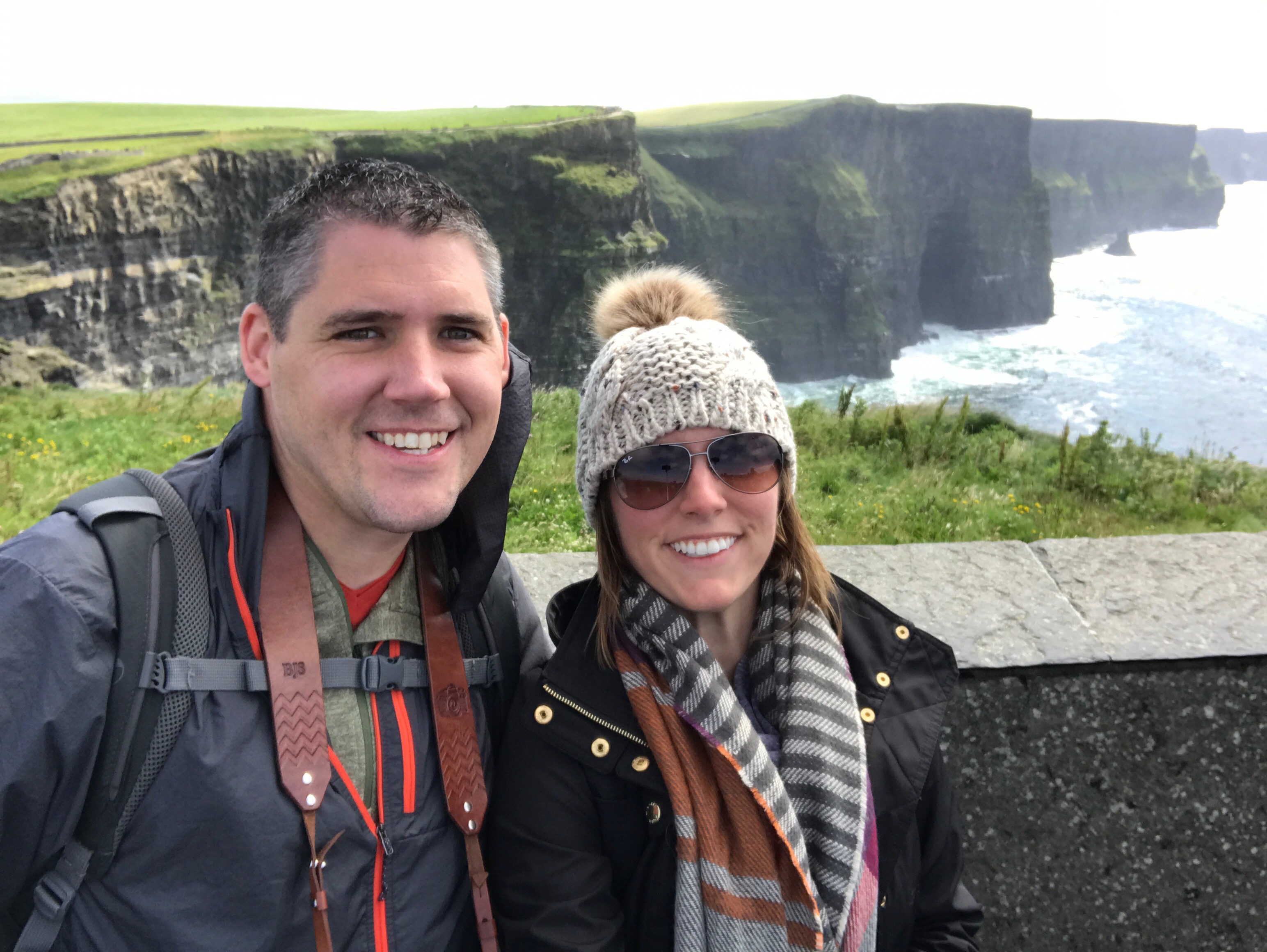 Although the morning weather had been glorious, the fog started to roll in as we approached the Cliffs of Moher near 3PM. I was initially starting to feel disappointed, as the forecast didn’t call for any chance of rain in this area until closer to 5/6 PM. We decided to layer up with all of rain/cold weather gear and make our way out to the Cliffs anyhow. As we got out of the car and approached the visitor center, sideways rain attacked! We decided to make a loop through the gift store, and by the time we had done so the sunshine we had all morning reappeared. It was truly incredible, and somehow the views continued to get even better no matter which direction we took another few steps toward! The cliffs provided a spectacular view of the Atlantic Ocean and Aran Islands from it’s varied heights (390-700 ft tall from the water). This really felt like the highlight of our trip, especially as we returned to the car and sideways rain immediately started again. Phewww, we got beyond lucky.