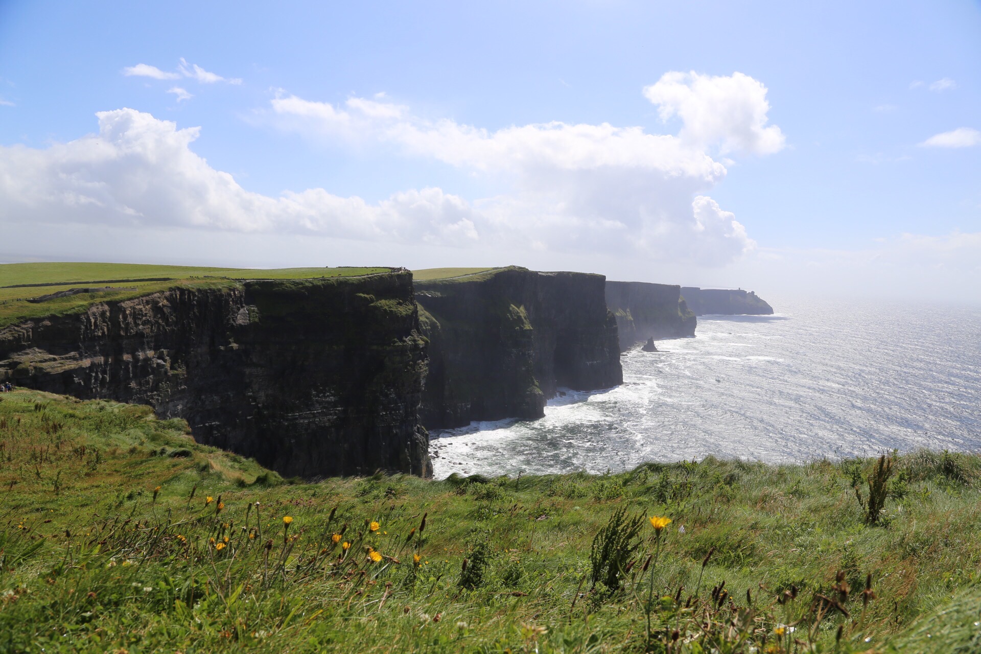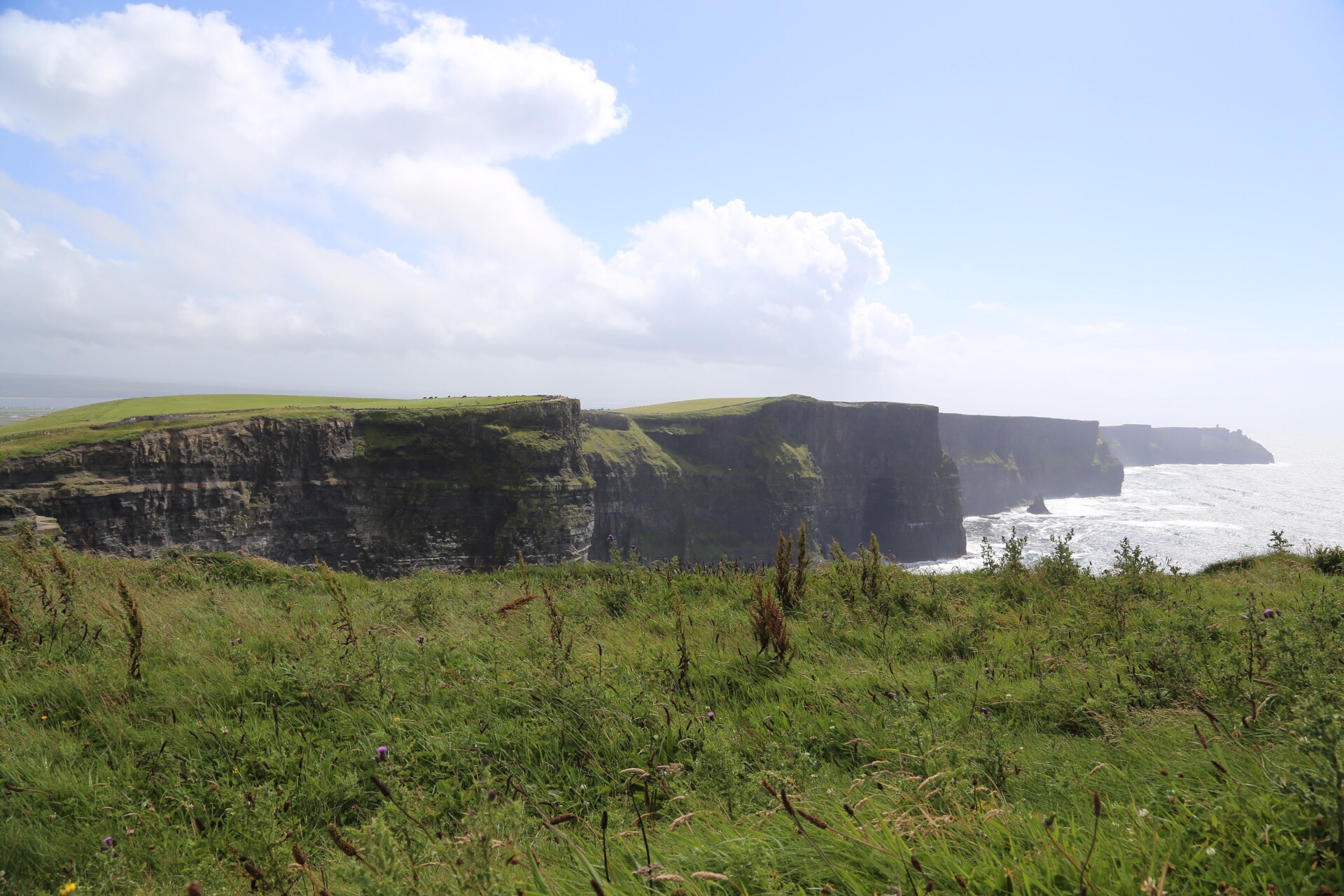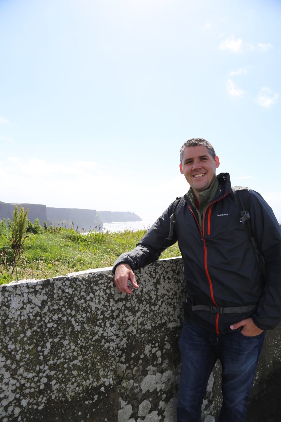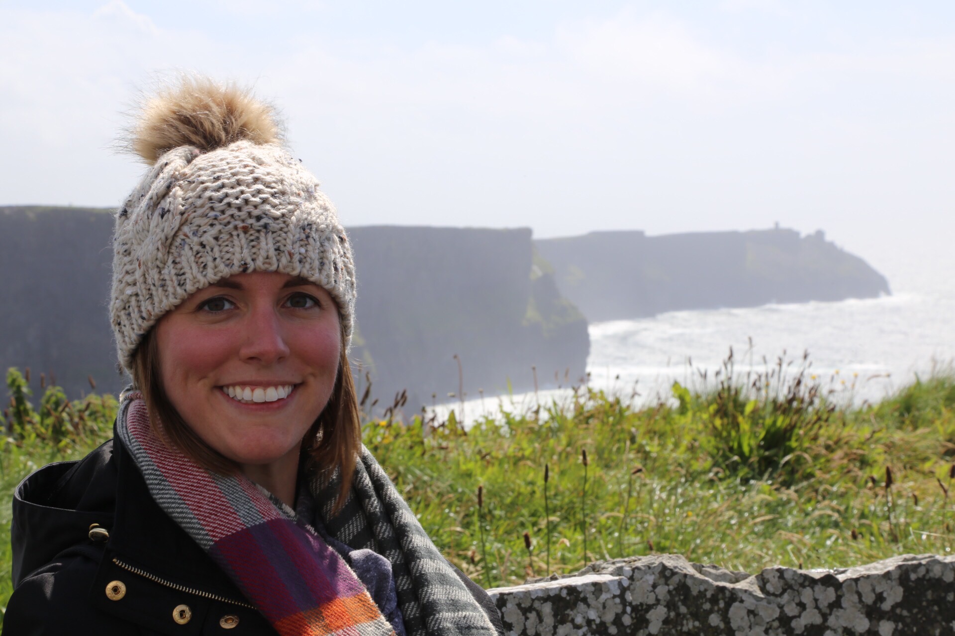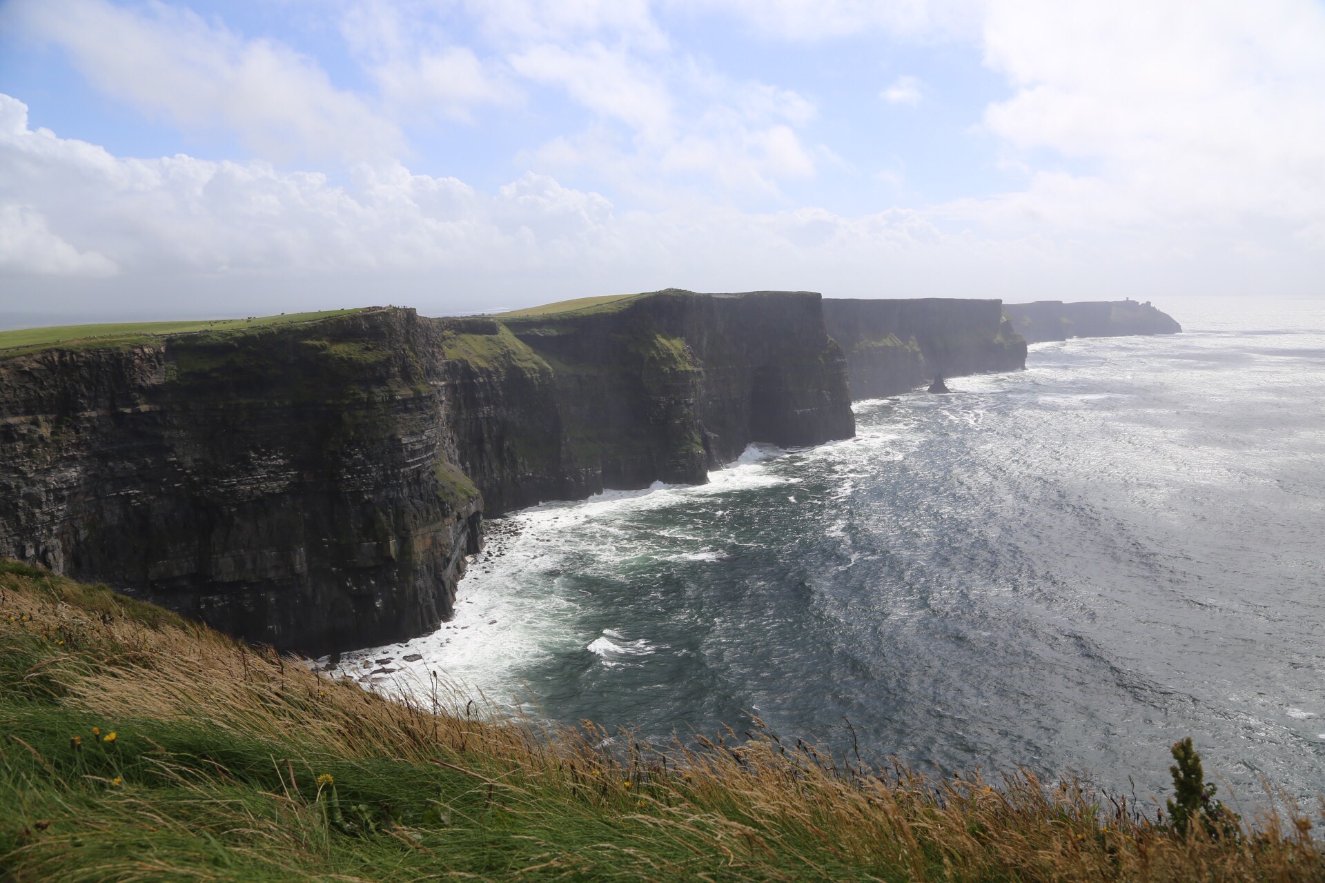 Although the morning weather had been glorious, the fog started to roll in as we approached the Cliffs of Moher near 3PM. I was initially starting to feel disappointed, as the forecast didn’t call for any chance of rain in this area until closer to 5/6 PM. We decided to layer up with all of rain/cold weather gear and make our way out to the Cliffs anyhow. As we got out of the car and approached the visitor center, sideways rain attacked! We decided to make a loop through the gift store, and by the time we had done so the sunshine we had all morning reappeared. It was truly incredible, and somehow the views continued to get even better no matter which direction we took another few steps toward! The cliffs provided a spectacular view of the Atlantic Ocean and Aran Islands from it’s varied heights (390-700 ft tall from the water). This really felt like the highlight of our trip, especially as we returned to the car and sideways rain immediately started again. Phewww, we got beyond lucky.